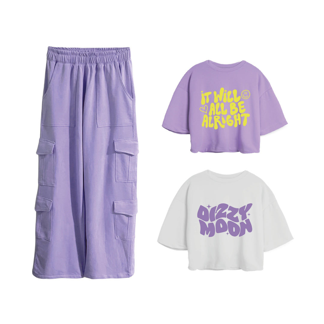 CONJUNTO 1 CARGO BURDA (LILA) + 2 OVERSIZE BURDA DAMA (LILA/AMARILLO ALL BE + BLANCO/LILA DIZZY)