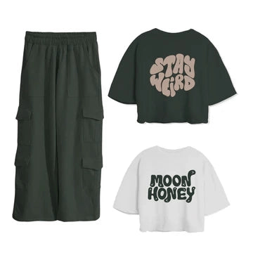 CONJUNTO 1 CARGO BURDA (VERDE MILITAR) + 2 OVERSIZE BURDA DAMA (VERDE MILITAR/WIERD) + BLANCO/VERDE MILITAR HONEY)
