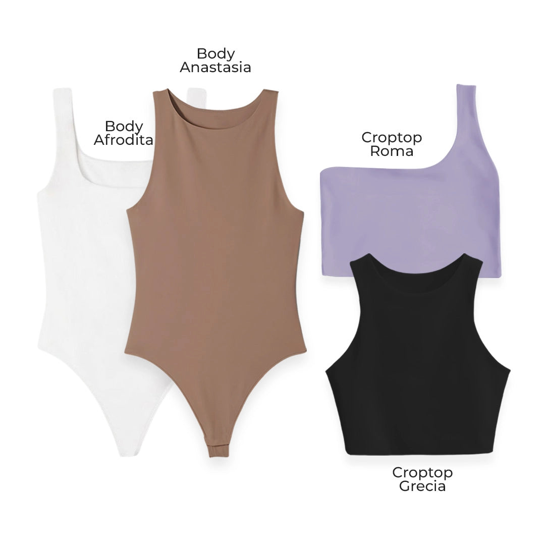 LLEVA 2 BODYS + 2 CROPTOP (REGALO) - AFRODITA (BLANCO) ANASTASIA (CHOCOLATE) ROMA (LILA) GRECIA (NEGRO)