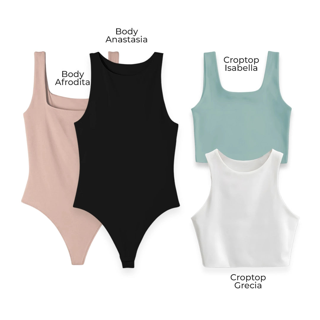LLEVA 2 BODYS + 2 CROPTOP (REGALO) - AFRODITA (CAMEL) ANASTASIA (NEGRO) ISABELLA (OLIVA) GRECIA (BLANCO)