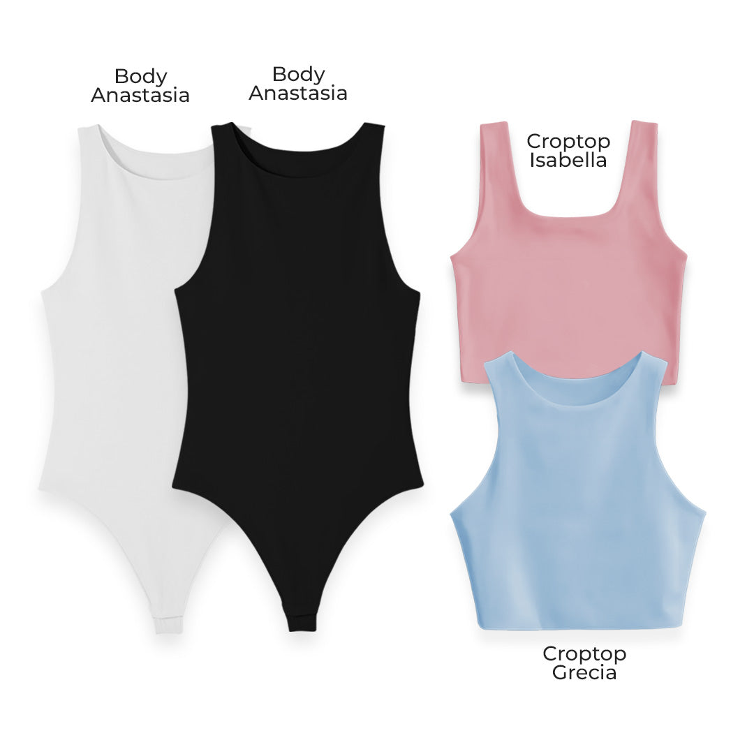LLEVA 2 BODYS + 2 CROPTOP (REGALO) - ANASTASIA (BLANCO) ANASTASIA (NEGRO) ISABELLA (ROSADO) GRECIA (AZUL CIELO)